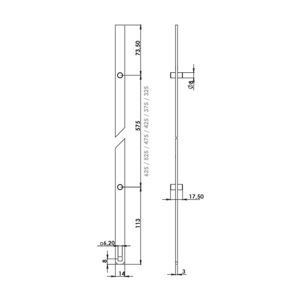 Asta piatta metallica per serratura con perni. Progettata per la costruzione di chiusure ad asta con serratura, ideale per un uso professionale su armadi metallici o quadri elettrici. Lunghezza totale: 575 cm. Perni con diametro di 8mm e larghezza 17,50 mm.